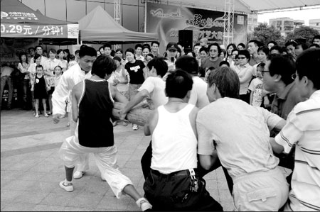记者在现场看到,身着白色太极服的张册扎起马步,拳头轻握。8名自愿上来“撞钟”的“罗汉”,个个摩拳擦掌,更有甚者赤脚上阵。8人抱紧约2.5米长的木桩后,合力喊到“1、2、3”,就咬紧牙关,猛力对准张册腹部撞去,连撞3次。然而,张册仍像铜墙铁壁般站立着,毫发无损,相反8名“罗汉”中有一人倒地,两人松了手。边上围观的市民,个个看得惊呆。